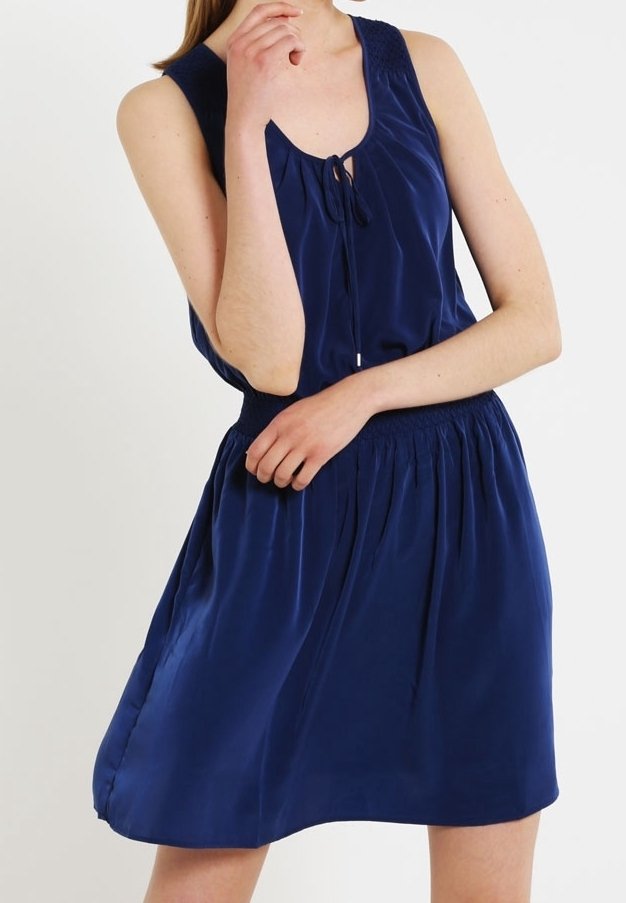 Robe bleu marine sans manches avec un col rond, un cordon de serrage, et une taille élastique. Tissu lisse et jupe fluide.