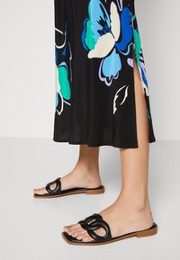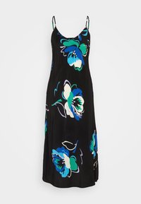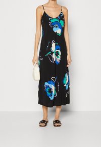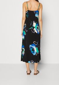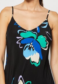 Robe noire sans manches avec un col en V, ornée de grands motifs floraux turquoise et blancs ; design fluide et tissu léger.