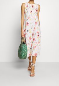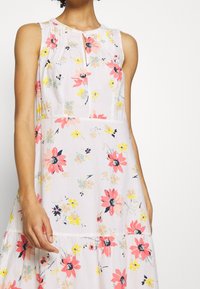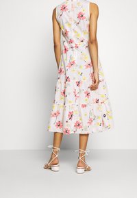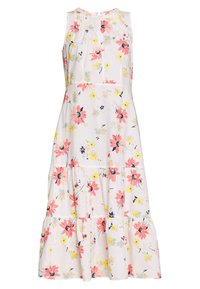 Robe midi fleurie avec des fleurs roses, jaunes et bleues sur un fond blanc, possédant une jupe à volants, un design sans manches et des plis subtils.