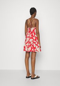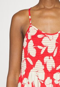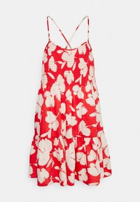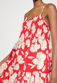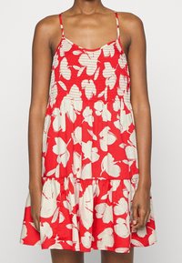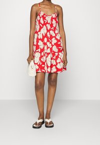 Femme portant une robe d'été rouge sans manches avec un motif floral abstrait blanc et de fines bretelles, debout devant un fond uni.