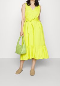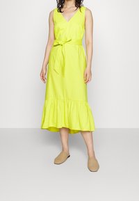 Robe sans manches jaune vif avec un décolleté en V, taille cintrée et ceinture à nouer, présentant un ourlet en dentelle évasée. Portée avec des chaussures à enfiler couleur beige.