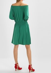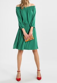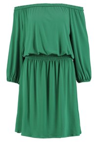 Robe verte à épaules dénudées avec manches longues, taille smockée et jupe fluide. Tissu lisse avec une texture douce.