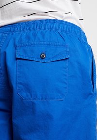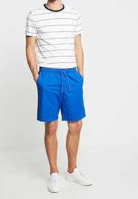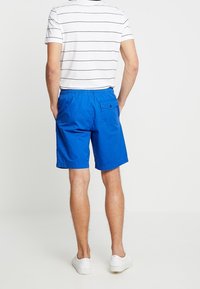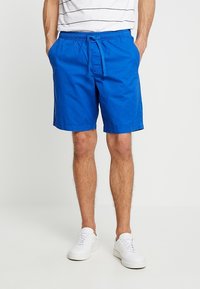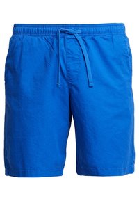 Shorts en coton bleu avec une ceinture élastique, un cordon de serrage et des poches latérales. Le tissu semble léger et lisse. Portés avec des baskets blanches.