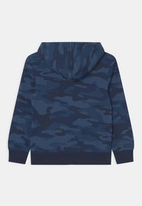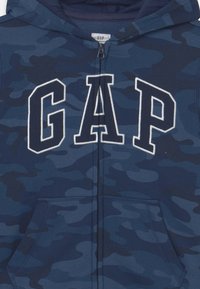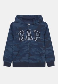 Sweat à capuche zippé bleu marine avec motif camouflage, arborant le logo "GAP" en blanc, poches kangourou, et poignets et ourlet côtelés.