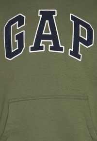 Sweat à capuche vert olive avec poche frontale et logo "GAP" en grandes lettres bleu marine bordées de blanc sur la poitrine.