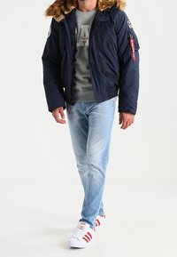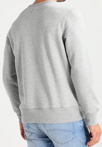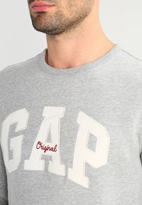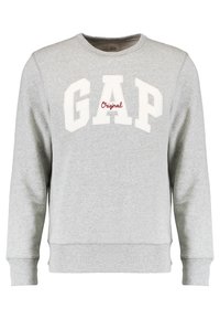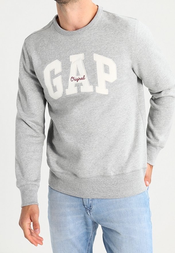 Homme portant un sweat-shirt GAP gris clair avec le texte « Original » et un jean bleu clair, debout avec une main dans la poche.