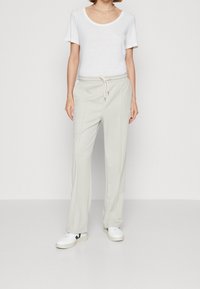 Femme portant un t-shirt blanc uni à manches courtes et col rond, associé à un pantalon gris clair sur mesure, debout devant un fond uni.