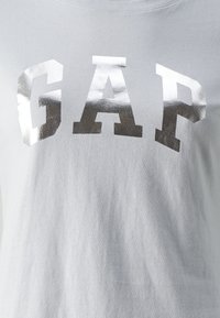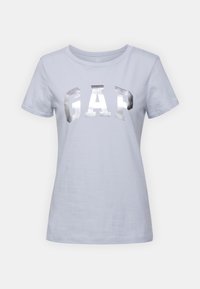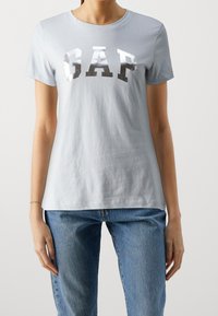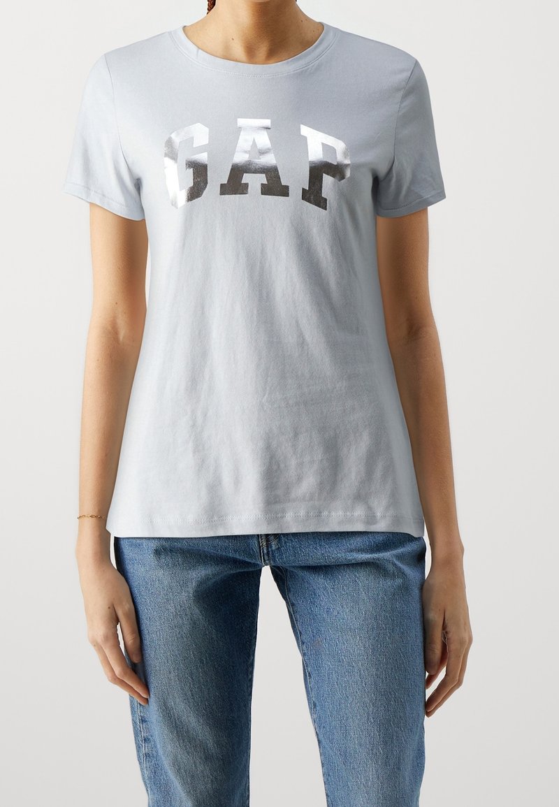 T-shirt en coton bleu clair à col rond et manches courtes, arborant le mot "GAP" en lettres métalliques argentées sur la poitrine.