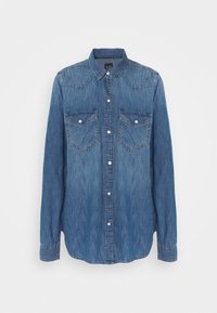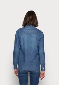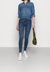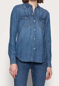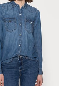 Femme portant une chemise en denim bleue à manches longues avec poches poitrine à rabat et un jean denim bleu assorti, debout devant un fond uni.