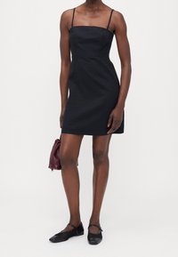Robe noire sans manches avec un décolleté carré, un corsage cintré et une jupe évasée. Texture lisse, design minimaliste sans ornements visibles.