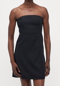 Femme portant une robe noire simple et sans bretelles, debout devant un fond clair uni, les bras détendus le long du corps.