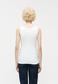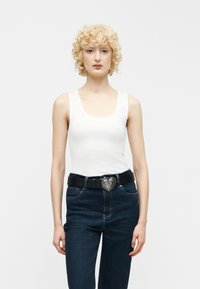 Femme blonde portant un haut blanc sans manches, jean large foncé avec ceinture en forme de cœur, tenant un sac à bandoulière beige à franges, debout avec la main dans la poche.