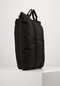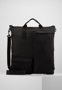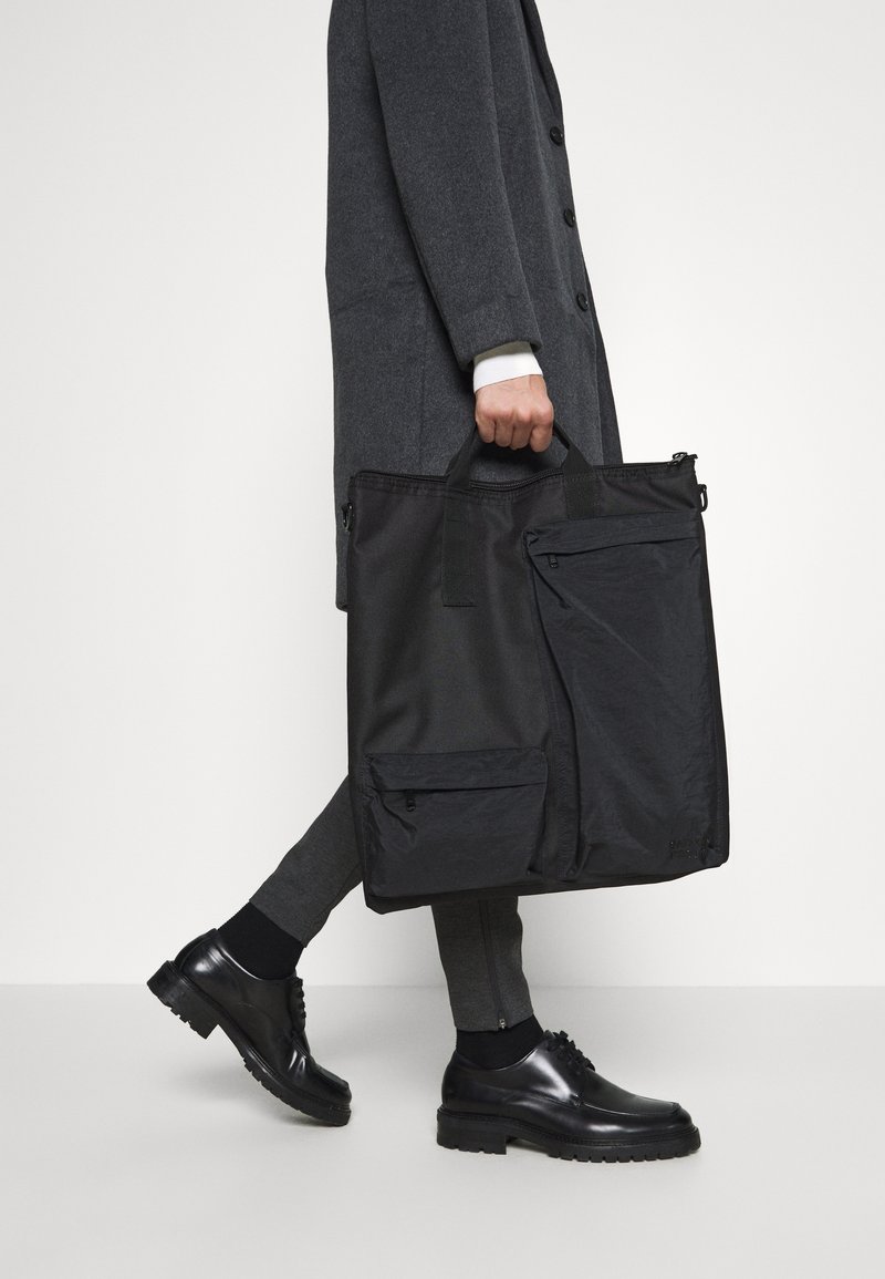 Personne portant un manteau gris foncé et un pantalon, tenant un grand sac fourre-tout noir avec plusieurs poches zippées, chaussée de chaussures habillées noires.