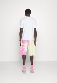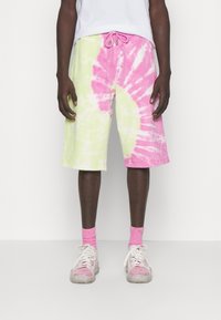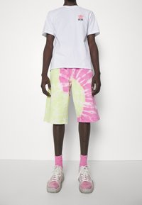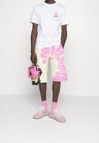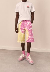 Personne portant un short tie-dye rose et jaune avec un patch GCDS, un t-shirt blanc, des chaussettes roses et des baskets transparentes roses, debout à l'intérieur.