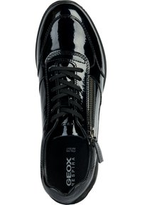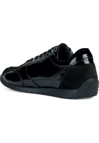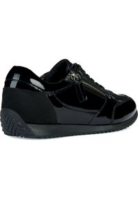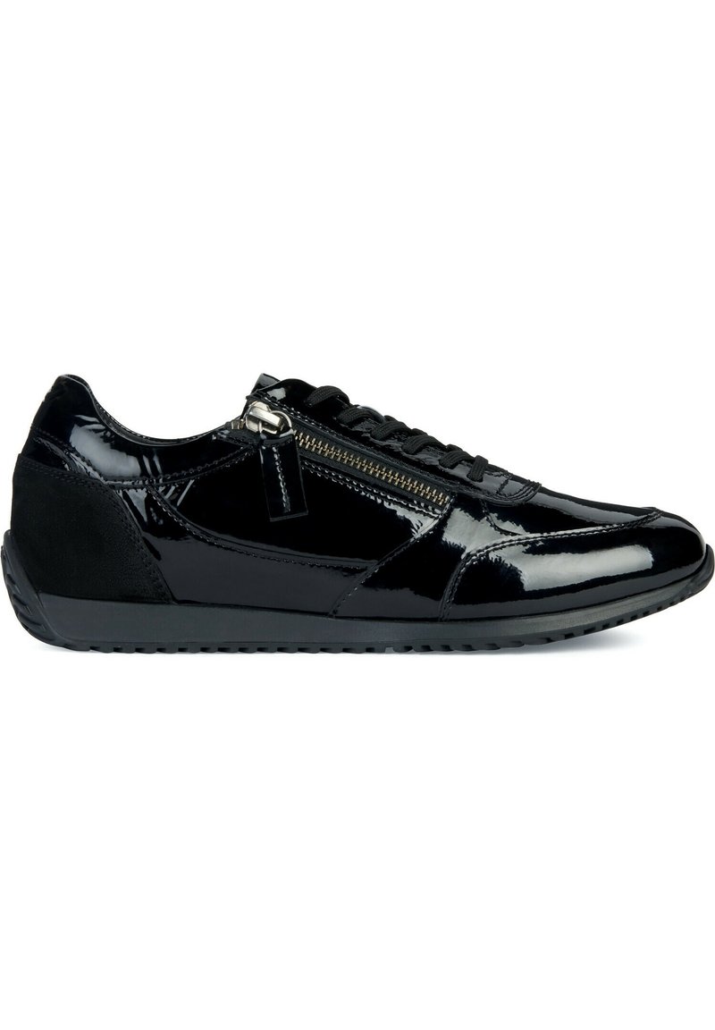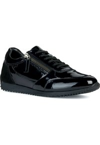 Baskets basses en cuir verni noir avec fermeture éclair latérale, avant à lacets et semelle en caoutchouc texturée.