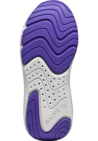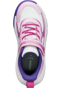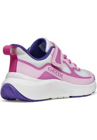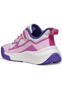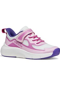 Baskets sportives pour enfant en rose et violet avec mesh blanc, strap Velcro, lacets, et semelle blanche épaisse, marquées du logo "GEOX" sur le côté.