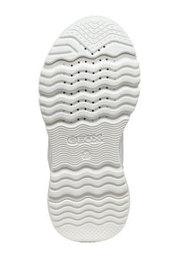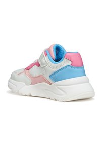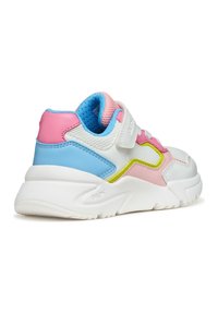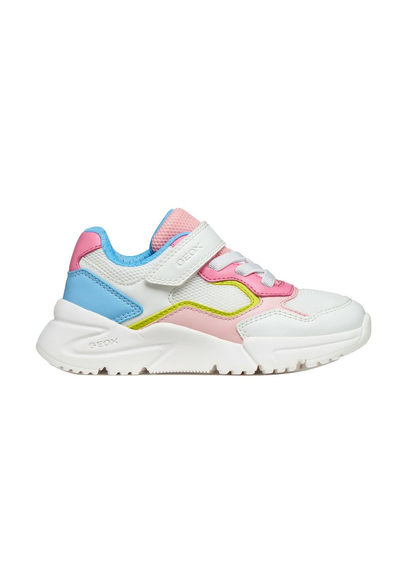 Baskets blanches avec des accents roses, bleus et verts, dotées d'une tige en mesh, d'une bride Velcro et d'une semelle épaisse.