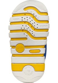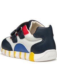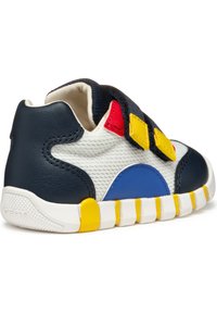Baskets pour enfants de couleur bleu marine, rouge, jaune et blanc, avec deux brides auto-agrippantes et une semelle segmentée pour un mouvement flexible.