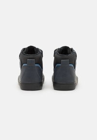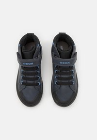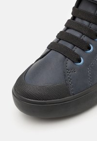 Baskets montantes en gris foncé avec accents noirs, coutures bleues et une bride en Velcro. Semelle en caoutchouc et embout texturé pour plus de durabilité.