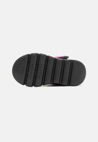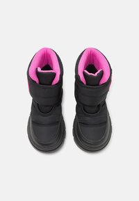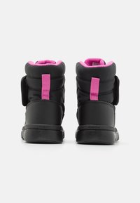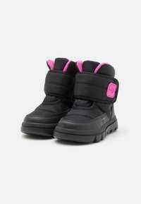 Botte d'hiver isolante pour enfants, noire et rose, avec une sangle Velcro, une semelle épaisse et un logo sur le côté et la sangle.