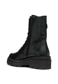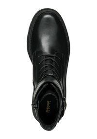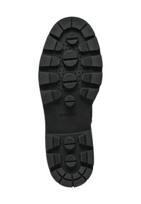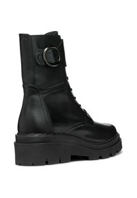 Bottines en cuir noir avec un laçage à l'avant, détail de boucle sur le côté, et une semelle en caoutchouc épaisse et robuste avec des crampons profonds pour une adhérence optimale.