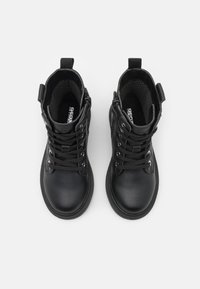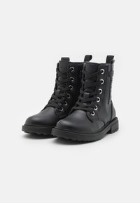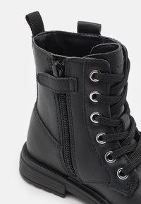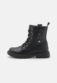 Bottines en cuir noir avec un bout arrondi, un laçage à l'avant, des clous décoratifs et un petit talon carré. Surface texturée, languette à l'arrière.