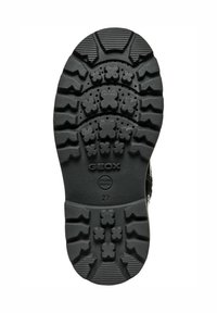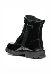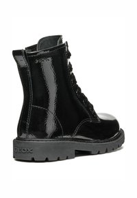 Bottes cavalières en cuir verni noir avec un bout rond, un laçage à l'avant et une semelle en caoutchouc robuste présentant des motifs texturés sur la tige.