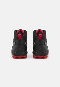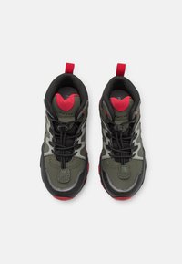 Botte de randonnée montante noire et verte foncée avec des accents rouges, semelle robuste, système de laçage rapide et languette à l'arrière, vue de côté.