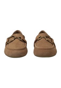 Mocassins en cuir brun clair avec un bout pointu, une sangle décorative ornée de petits clous, et une semelle plate. Texture lisse et design minimal.