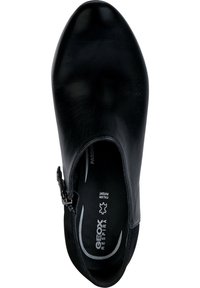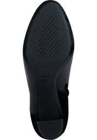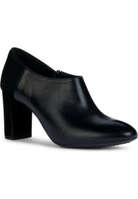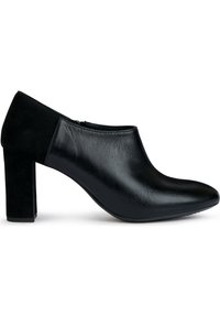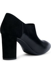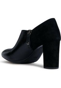 Chaussure à talons hauts noirs avec un dessus en cuir lisse et un dos en daim. Le design comprend un bout arrondi et un talon carré épais.