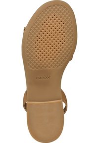 Sandale slingback en cuir tan avec une large bande et des détails en métal doré. Semelle plate avec une texture lisse, conçue pour le confort et une utilisation facile.