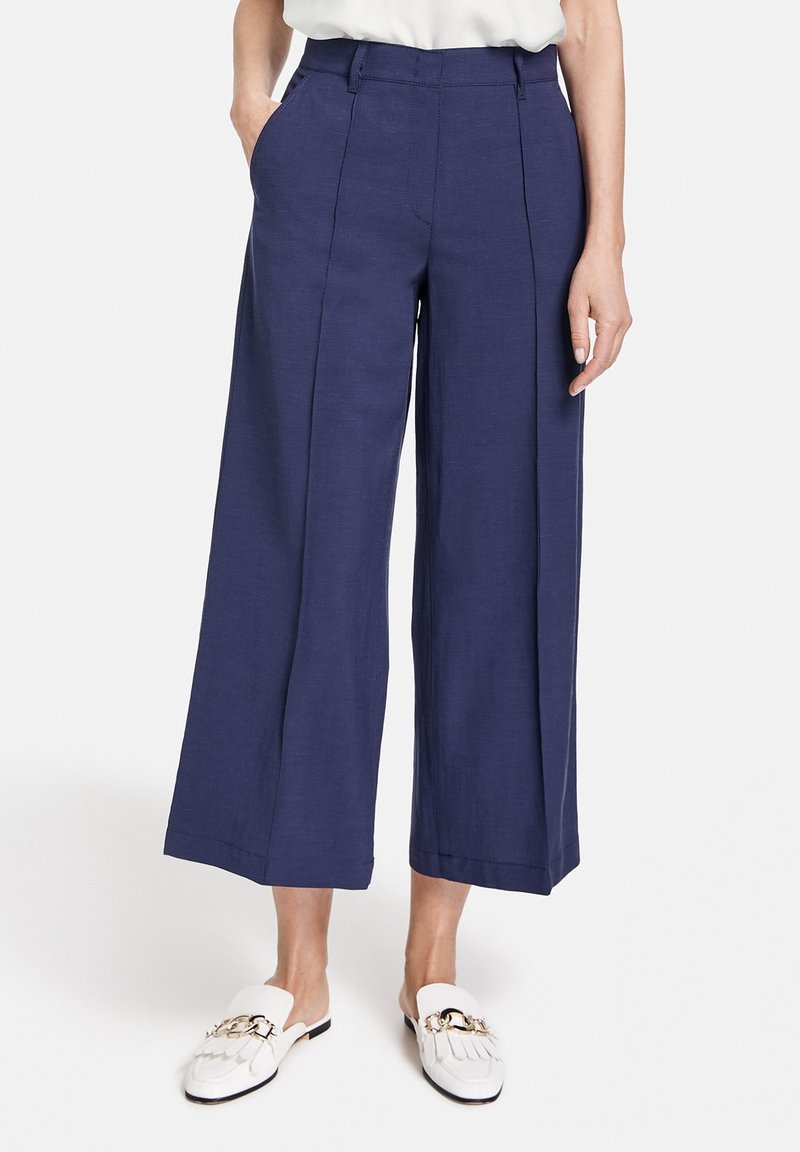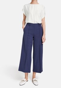 Pantalons larges bleu marine en tissu léger, avec une taille haute, des plis sur le devant et des poches latérales. Porté avec des mocassins blancs.