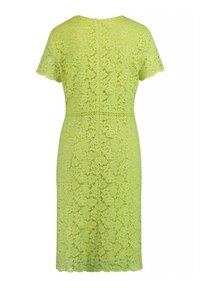 Robe en dentelle d'un vert lime vif, manches courtes, silhouette ajustée, motif floral, ourlet festonné, fermeture éclair au dos.