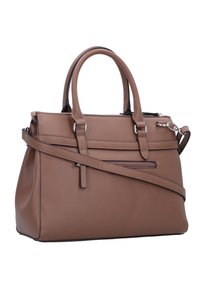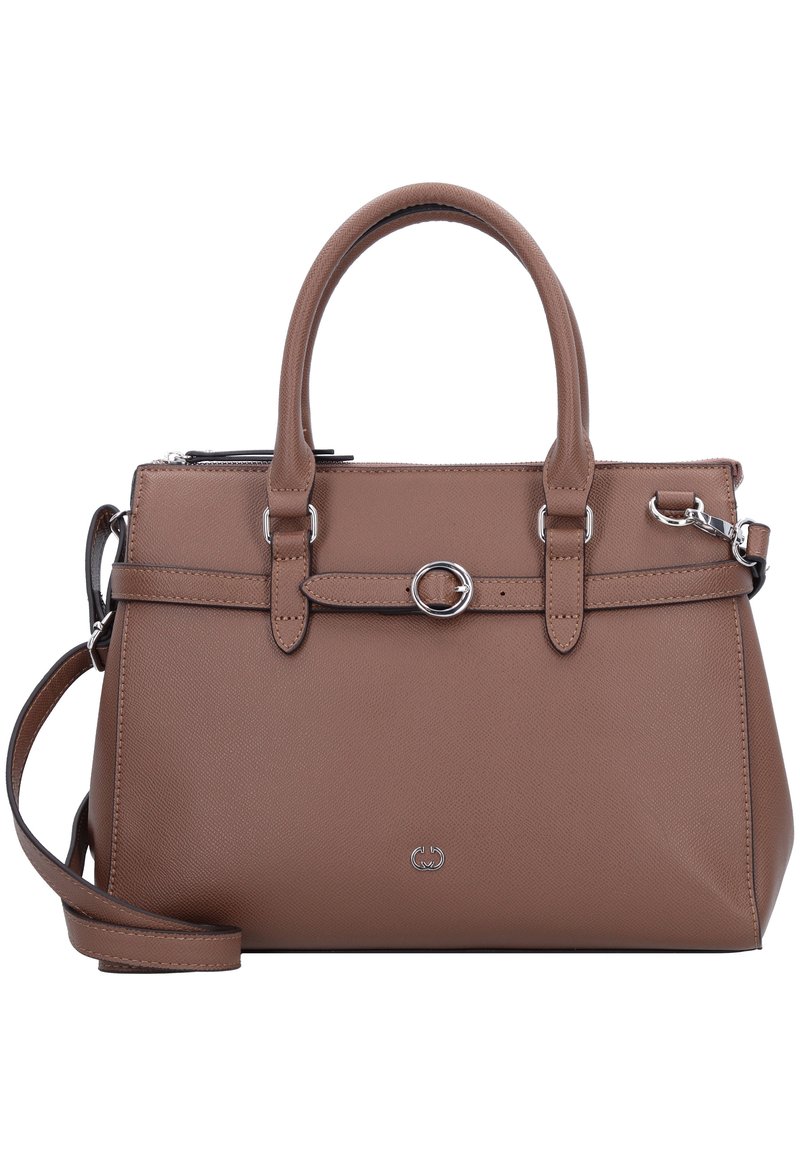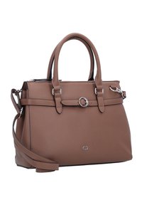 Sac à main en cuir structuré marron avec double poignée supérieure, bandoulière réglable, détail boucle argentée et petit logo métallique à l'avant.