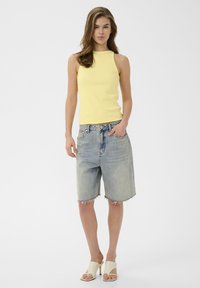 Femme aux longs cheveux bruns portant un haut jaune sans manches et un jean en denim bleu clair, debout avec une main dans la poche.
