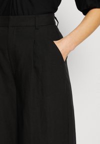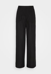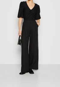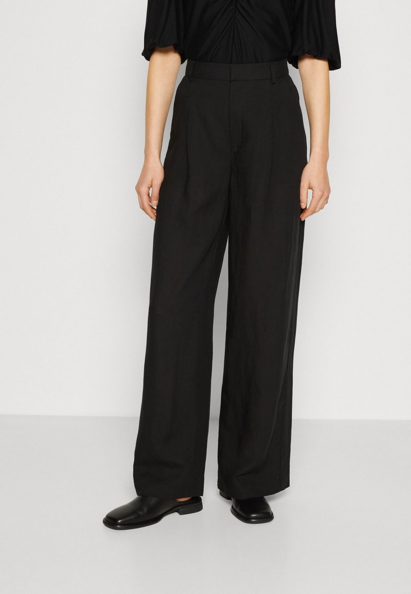 Pantalon noir à jambes larges avec une texture lisse, doté d'une taille haute et de plis subtils à l'avant. Assorti à des chaussures noires sans lacets.