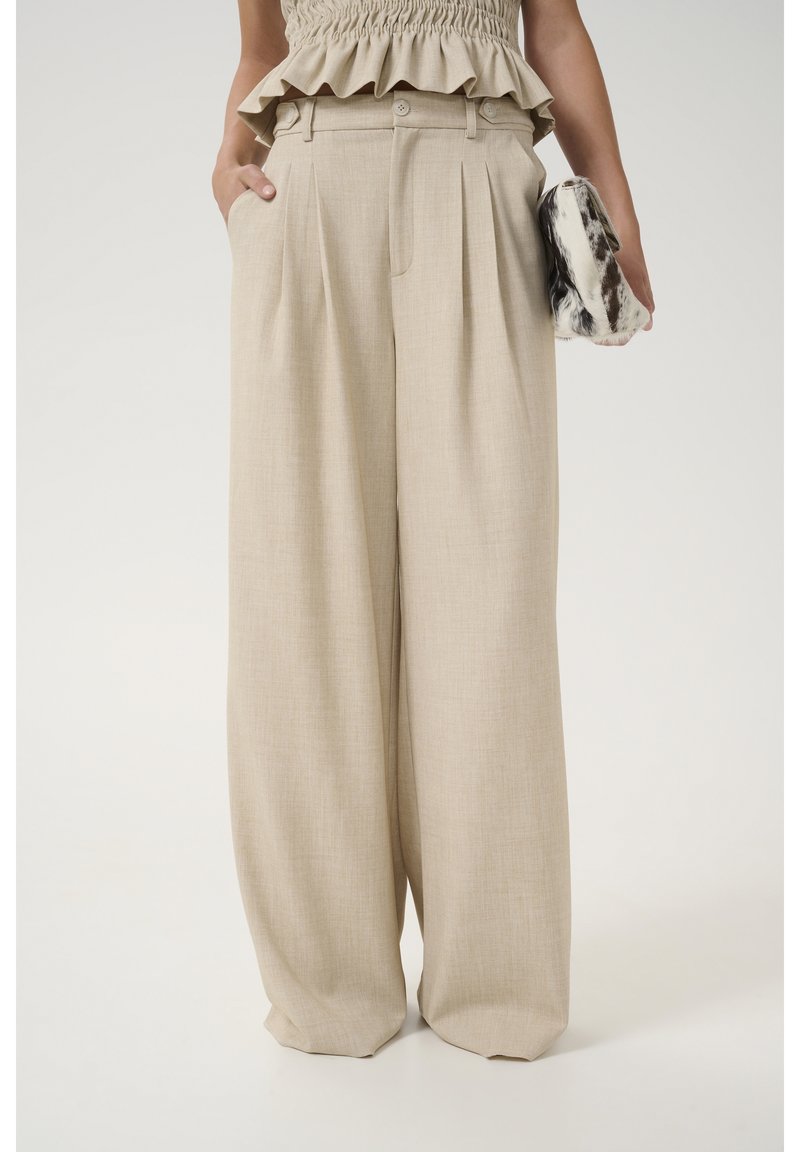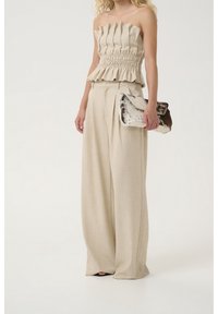 Pantalon beige à jambes larges avec plis sur le devant, taille haute et passants pour ceinture, associé à un top à volants ; tenant une pochette en fourrure noire et blanche.