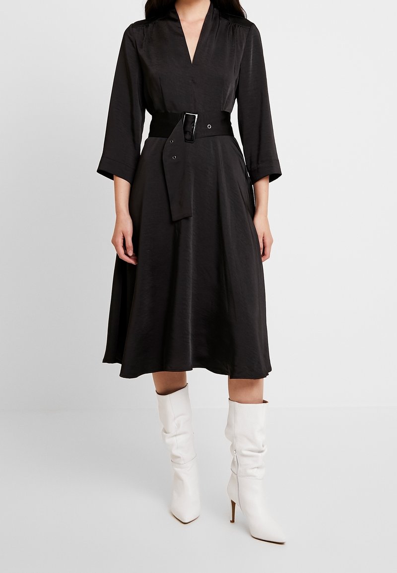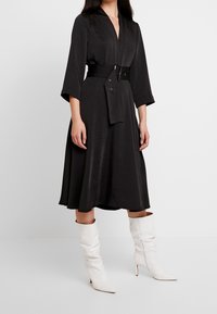 Femme portant une robe midi noire à manches trois-quarts, une large ceinture à la taille, et des bottines à talons blanches à bout pointu.
