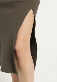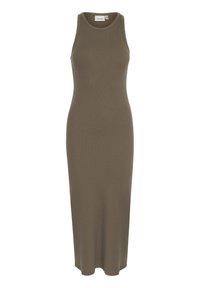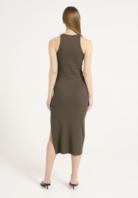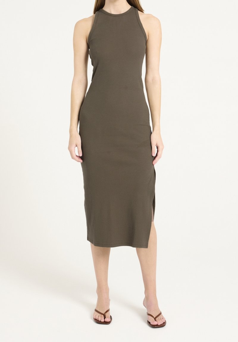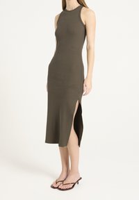 Femme portant une robe midi sans manches, olive verte, côtelée, avec une fente sur le côté et des sandales plates marron à bride en T, sur fond blanc.