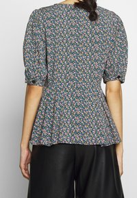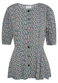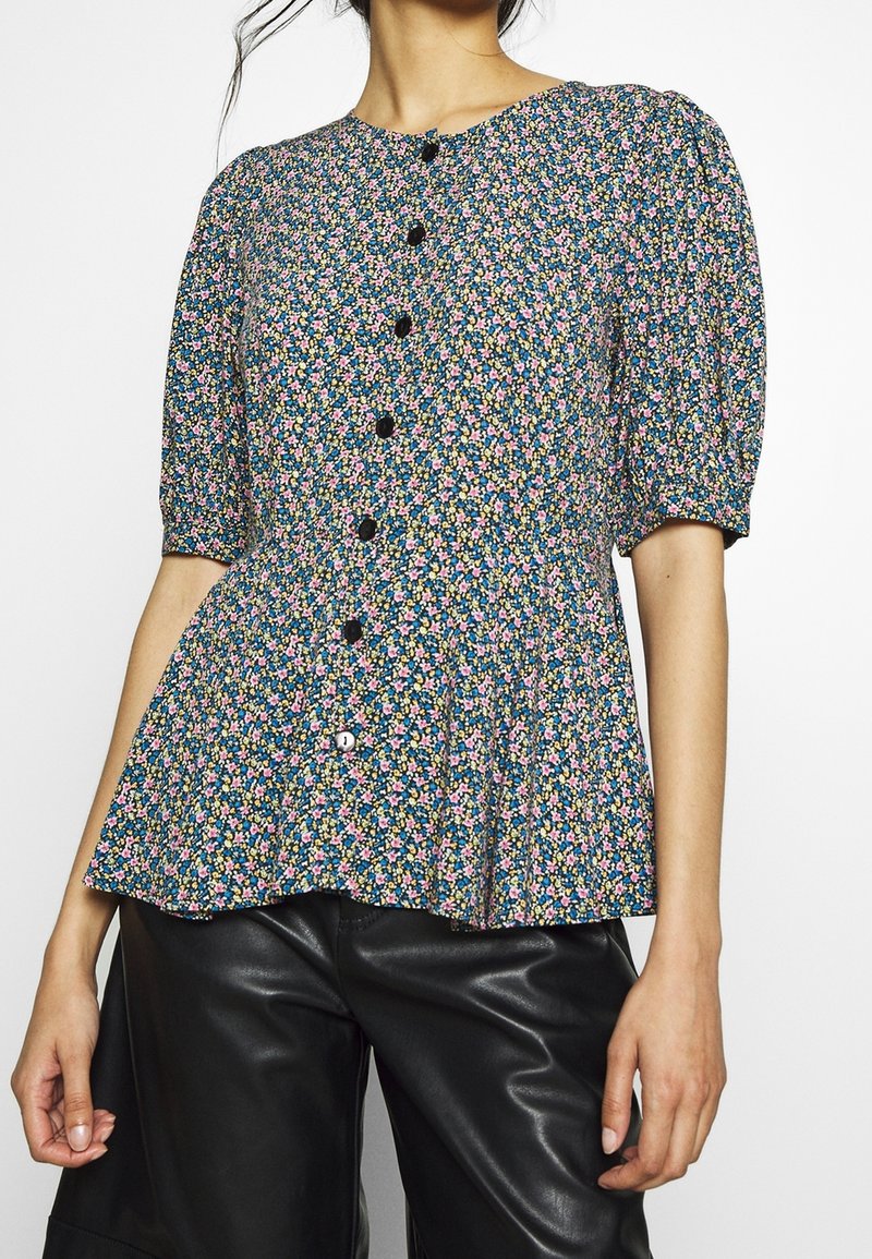 Femme portant un chemisier à manches bouffantes bleu à fleurs et un pantalon en cuir noir, visible des épaules aux hanches.