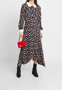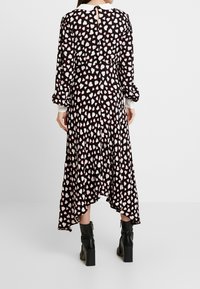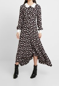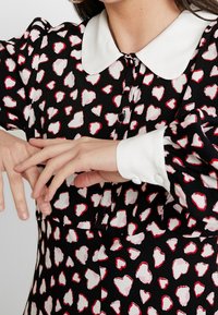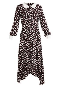 Femme portant une robe midi noire avec des motifs de cœurs blancs et roses, col et poignets blancs, assortie à des bottines noires à talons.