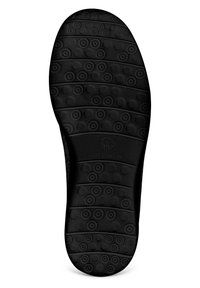 Chaussures de sport noires en tissu texturé, portées avec un pantalon beige clair à taille nouée et un pull en maille marron avec des coutures détaillées.