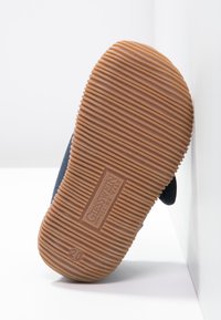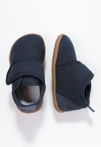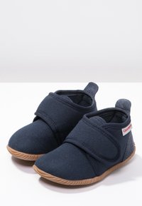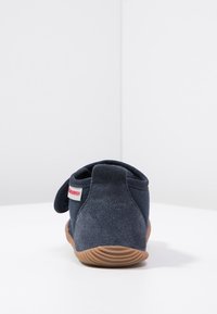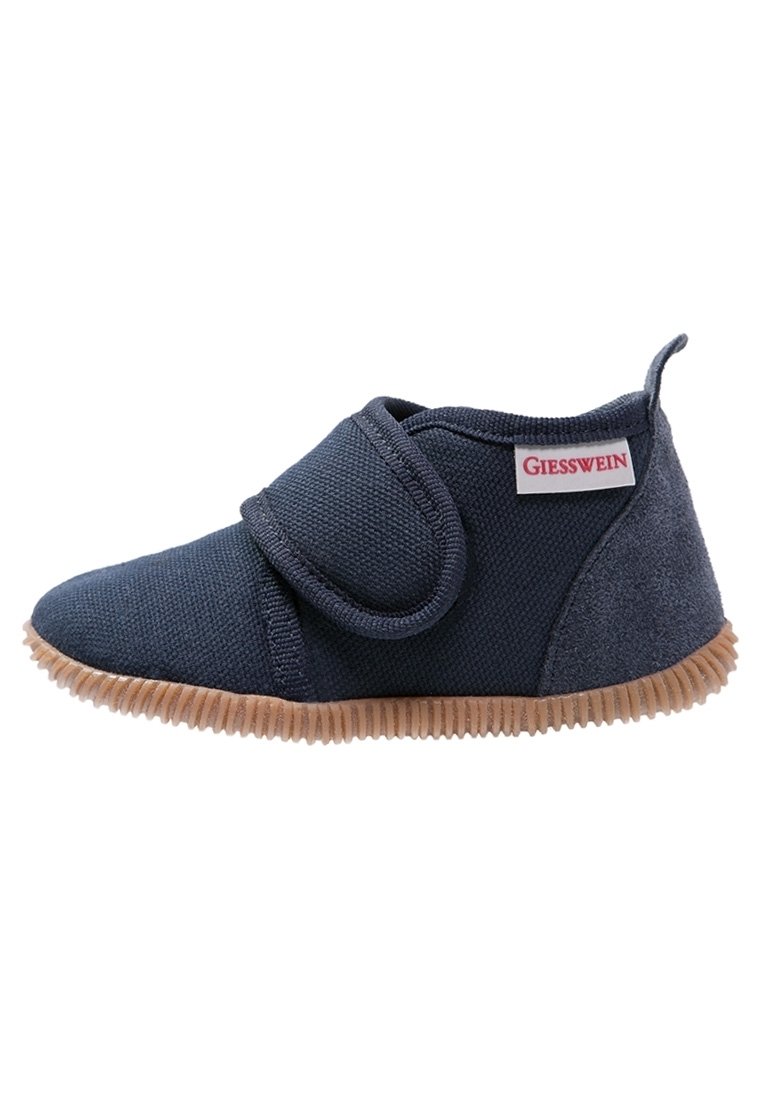Chausson en tissu bleu marine doux avec sangle réglable en Velcro et semelle texturée brun clair, avec étiquette de la marque Giesswein.