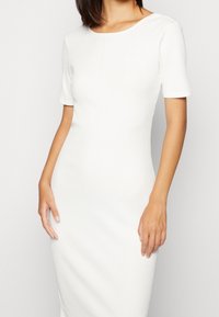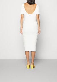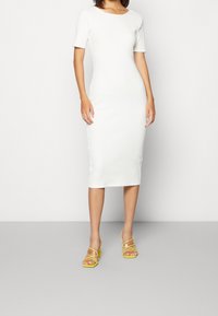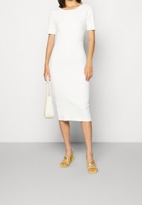 Femme portant une robe midi moulante blanche côtelée à manches mi-longues et des sandales à talons blocs jaunes à brides, debout devant un fond uni.