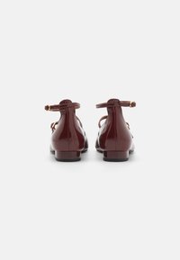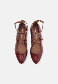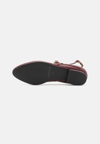 Ballerines en cuir verni bordeaux de type Mary Jane avec un petit talon carré, un bout rond, et une seule lanière ajustable à la cheville avec une boucle dorée.