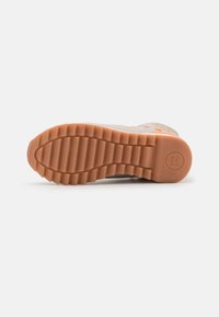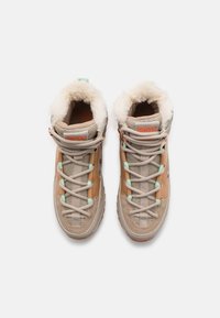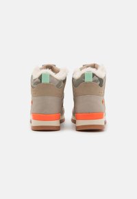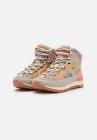 Baskets montantes en tissu beige à motif camouflage, avec des accents orange et une semelle texturée. Les lacets et le col rembourré viennent parfaire le design.