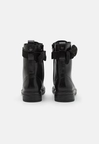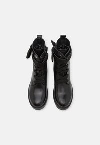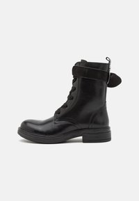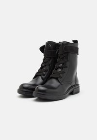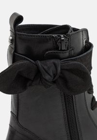 Bottine en cuir noir avec un laçage à l'avant, une sangle en suède et une languette, petit talon et bout arrondi, présentée en profil latéral sur fond blanc.