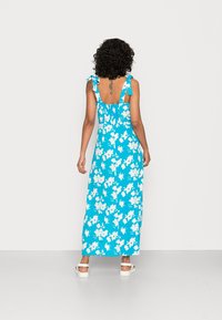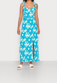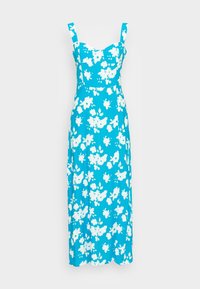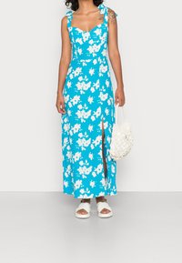 Robe maxi florale en bleu vif avec des fleurs blanches, dotée de bretelles ajustables, d'un corsage ajusté et d'une fente à l'avant pour faciliter les mouvements.