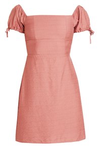 Femme portant une robe mini rose poussiéreuse, cintrée et décolletée, avec de courtes manches bouffantes nouées à l'ourlet, sur un fond uni.