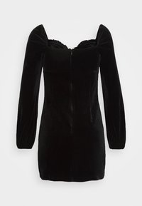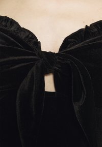 Robe en velours noir avec de longues manches bouffantes, décolleté off-shoulder, détail de nœud central, forme ajustée et longueur mini.
